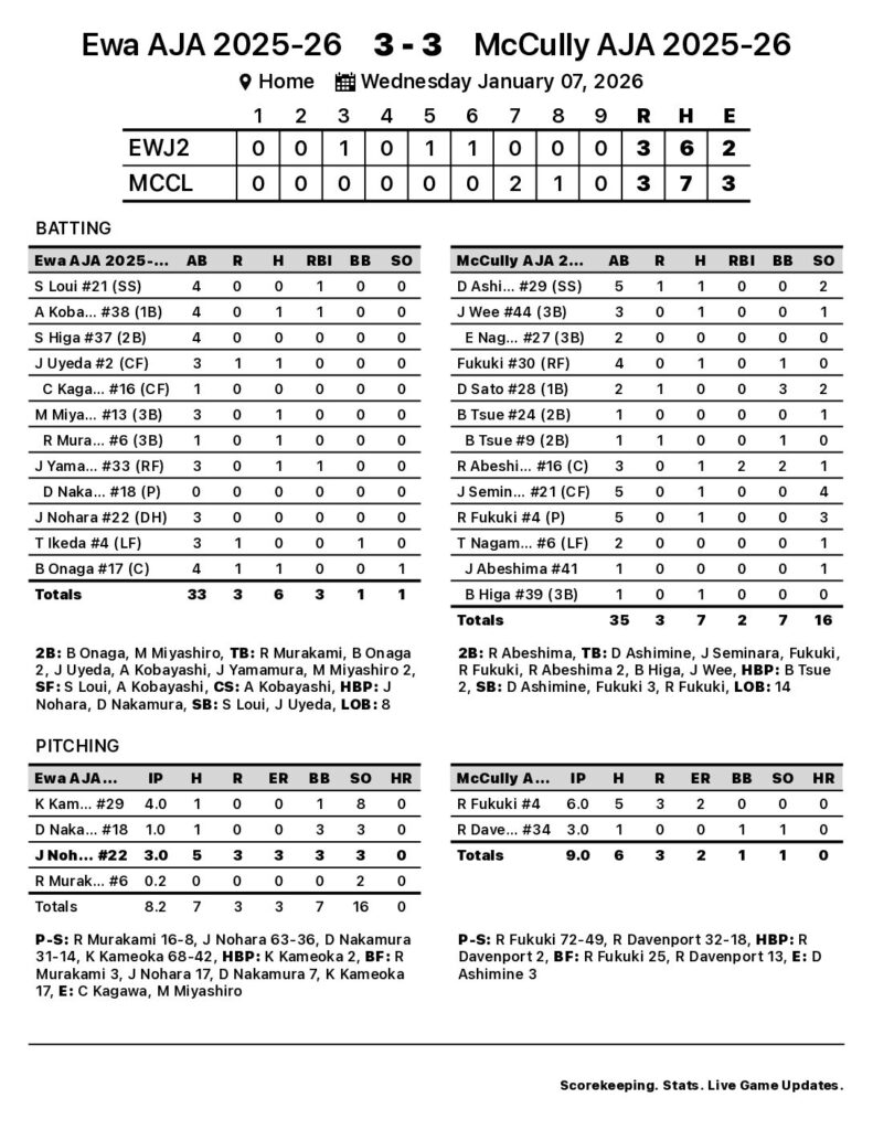 Ryllen Abeshima led McCully AJA 2025-26 with two runs batted in. The catcher went 1-for-3 on the day. Abeshima, Jared Seminara, Fukuki, Brayden Higa, Dru Ashimine, Justyn Wee, and Fukuki each collected one hit for McCully AJA 2025-26. Sato paced McCully AJA 2025-26 with three walks. Overall, the team had patience at the plate, piling up seven walks for the game. Fukuki stole three bases. McCully AJA 2025-26 stole five bases in the game.