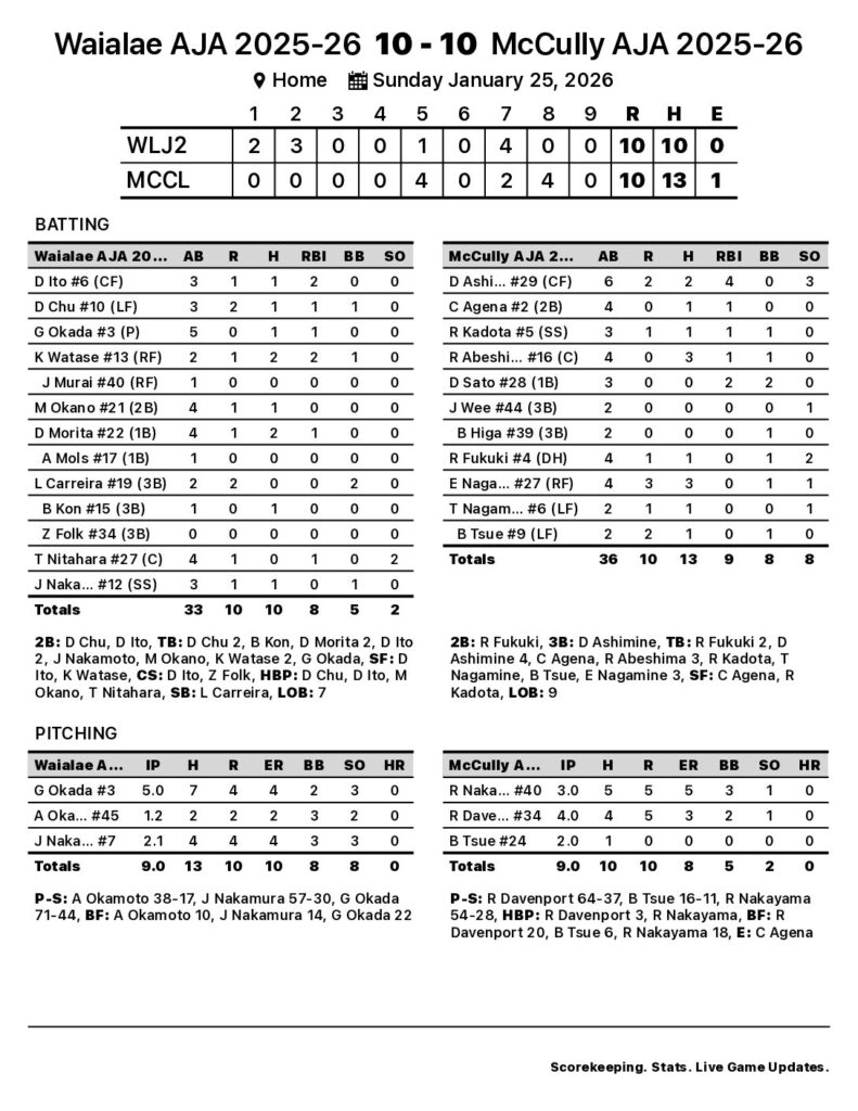 McCully AJA 2025-26 accumulated 13 hits in the game. Abeshima and Ethan Nagamine each collected three hits for McCully AJA 2025-26. Ashimine went 2-for-6 at the plate and led the team with four runs batted in. Sato paced McCully AJA 2025-26 with two walks. Overall, the team had patience at the plate, piling up eight walks for the game. McCully AJA 2025-26 turned one double play in the game.