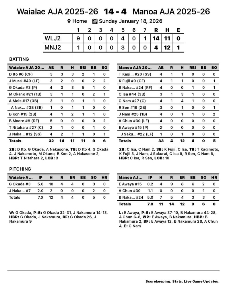 Okada earned the win for Waialae AJA 2025-26. The starter gave up 10 hits and four runs over five innings, striking out three and walking none. Bryson Nakamura pitched five innings in relief for Manoa AJA 2025-26. The hurler gave up seven hits and five runs (four earned) while, striking out three and walking three. Eric Awaya took the loss for Manoa AJA 2025-26. The starter went two-thirds of an inning, giving up nine runs (eight earned) on four hits, striking out two and walking six.
