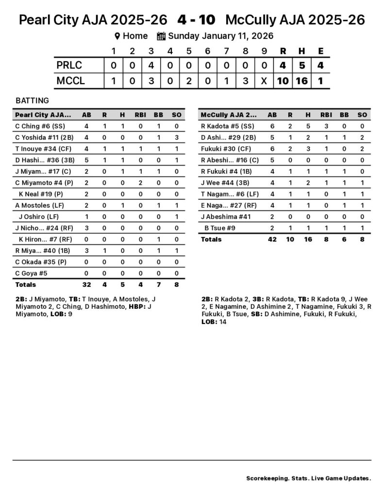Inouye, Colby Ching, Dustin Hashimoto, Ansin Mostoles, and Miyamoto each collected one hit for Pearl City AJA 2025-26. Miyamoto led the team with two runs batted in. Pearl City AJA 2025-26 had patience at the plate, collecting seven walks for the game. Pearl City AJA 2025-26 turned one double play in the game.