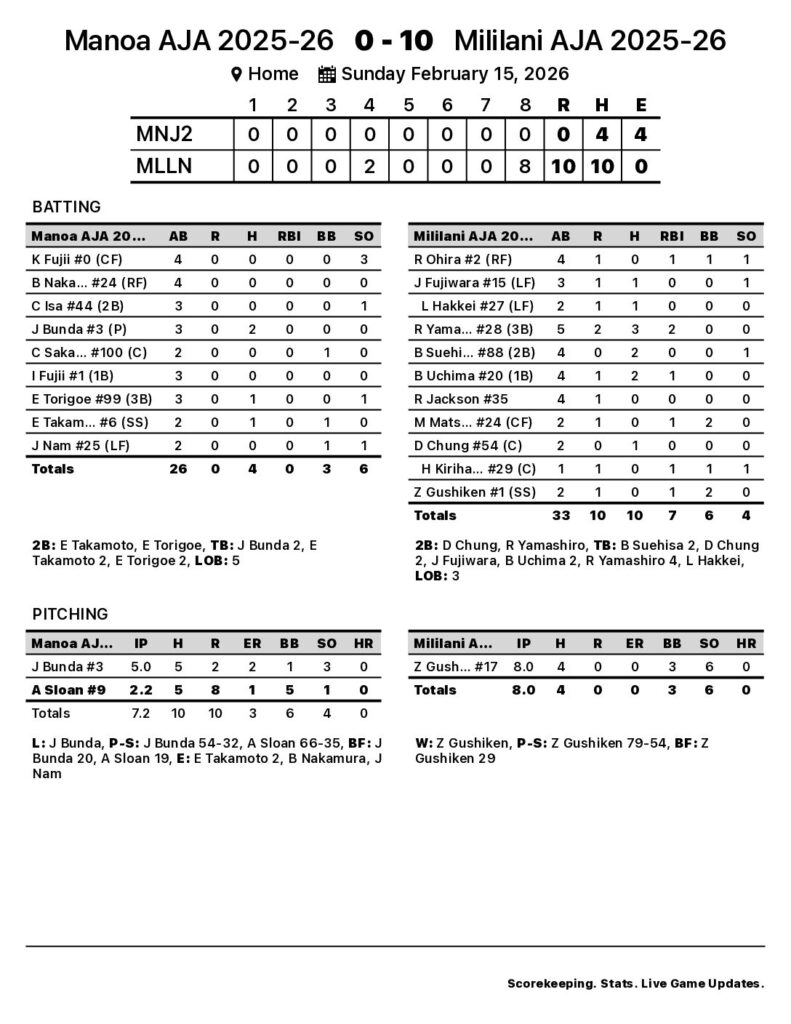 Ryne Yamashiro collected three hits in five at bats, as Mililani AJA 2025-26 defeated Manoa AJA 2025-26 10-0 on Sunday at Ala Wai. Yamashiro doubled in the eighth inning, singled in the fourth inning, and singled in the eighth inning.