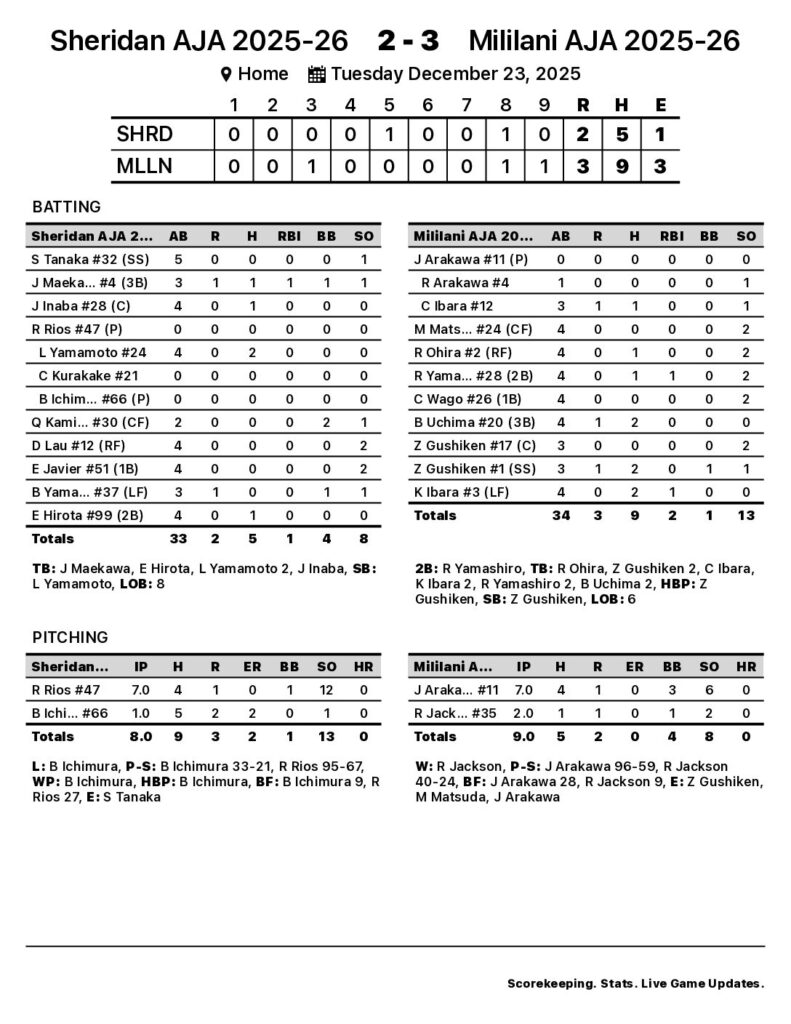 It came down to the wire on Tuesday, as Mililani AJA 2025-26 grabbed the victory in walk-off fashion, 3-2, over Sheridan AJA 2025-26. The game was tied at two in the bottom of the ninth when Kaiden Ibara singled, scoring one run.