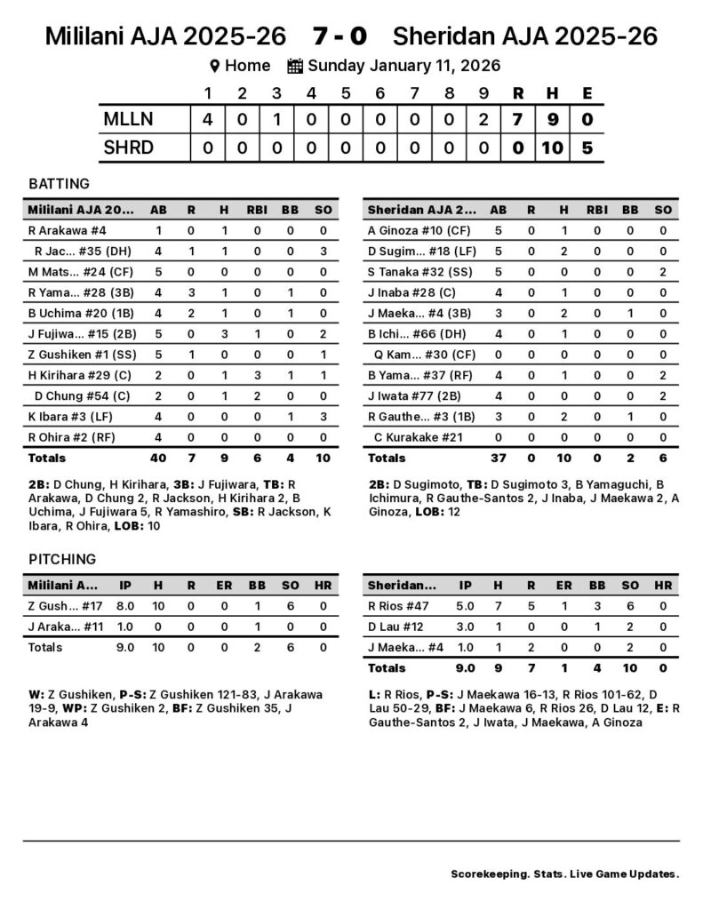 Zach Gushiken earned the win for Mililani AJA 2025-26. The starting pitcher gave up 10 hits and zero runs over eight innings, striking out six and walking one. Randyn Rios took the loss for Sheridan AJA 2025-26. The left-handed pitcher went five innings, giving up five runs (one earned) on seven hits, striking out six and walking three.