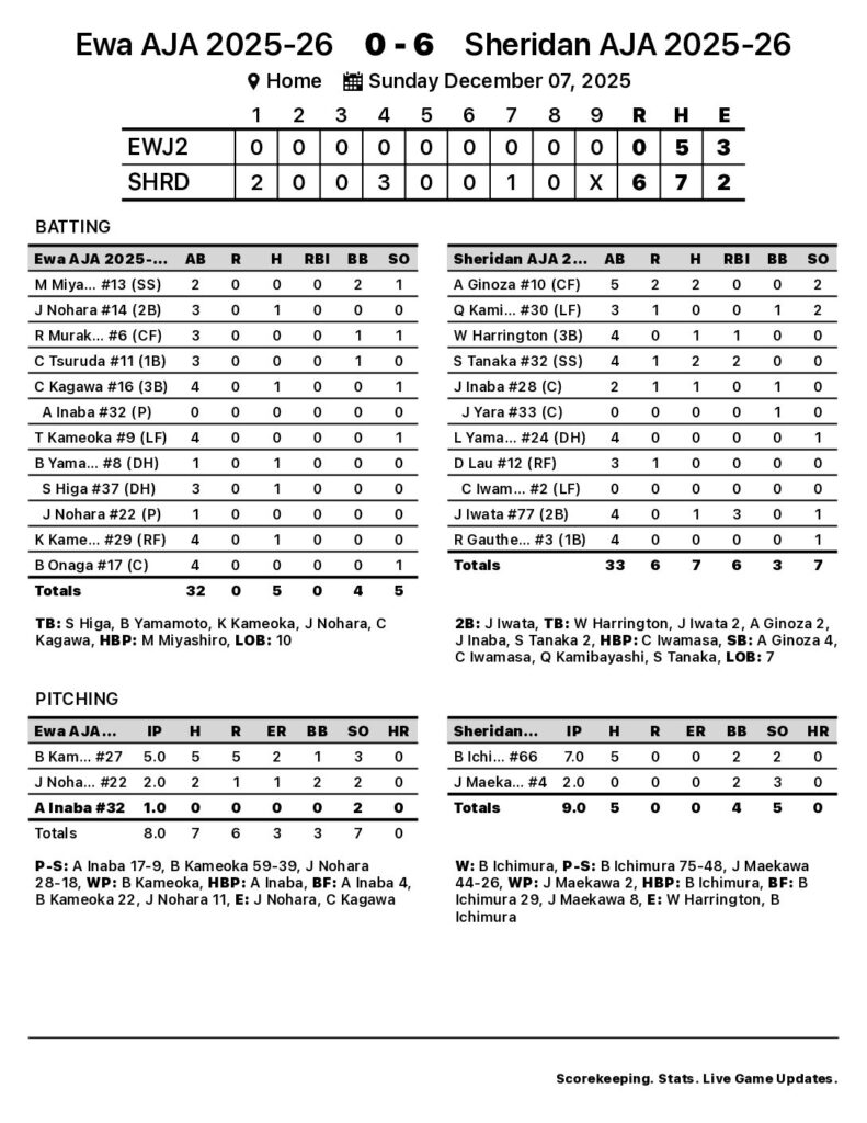 Ichimura earned the win for Sheridan AJA 2025-26. The starting pitcher gave up five hits and zero runs over seven innings, striking out two and walking two. Kameoka started on the hill for Ewa AJA 2025-26. The starting pitcher surrendered five hits and five runs (two earned) over five innings, striking out three and walking one. Maekawa tossed two innings of no-run ball for Sheridan AJA 2025-26 in relief. The reliever surrendered zero hits, striking out three and walking two.