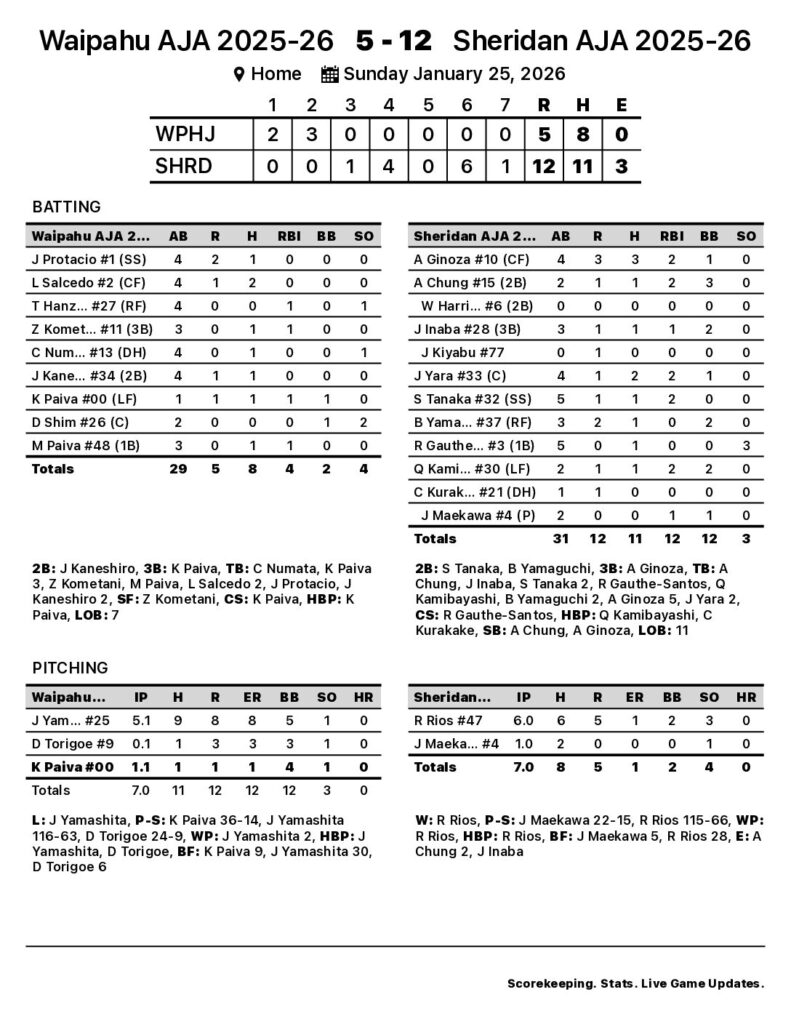 Randyn Rios earned the win for Sheridan AJA 2025-26. The starting pitcher gave up six hits and five runs (one earned) over six innings, striking out three and walking two. Jarren Yamashita took the loss for Waipahu AJA 2025-26. The pitcher went five and one-third innings, allowing eight runs on nine hits, striking out one and walking five. Joey Maekawa threw one inning of scoreless ball for Sheridan AJA 2025-26 in relief. The pitcher gave up two hits, striking out one and walking none.