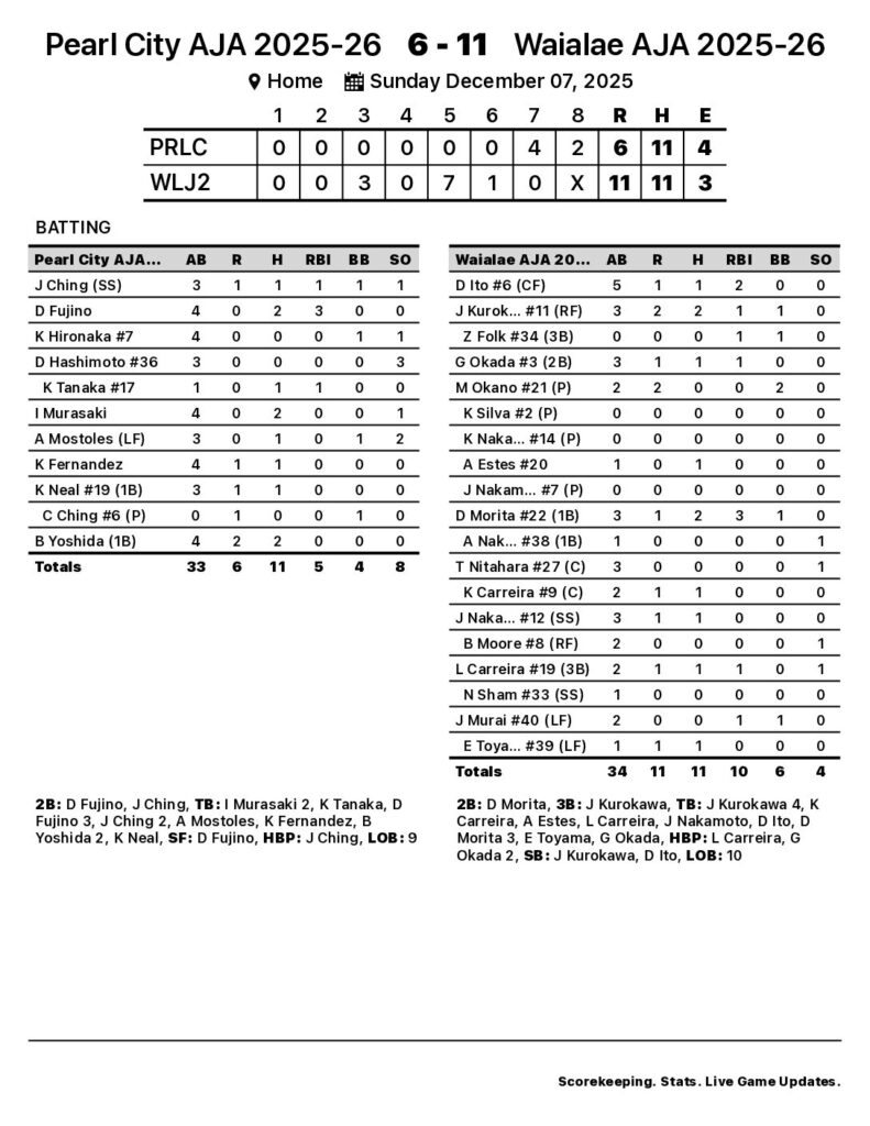 Pearl City AJA 2025-26 piled up 11 hits in the game. Bradyn Yoshida, Devin Fujino, and Ian Murasaki each collected two hits for Pearl City AJA 2025-26. Fujino went 2-for-4 at the plate and led the team with three runs batted in.