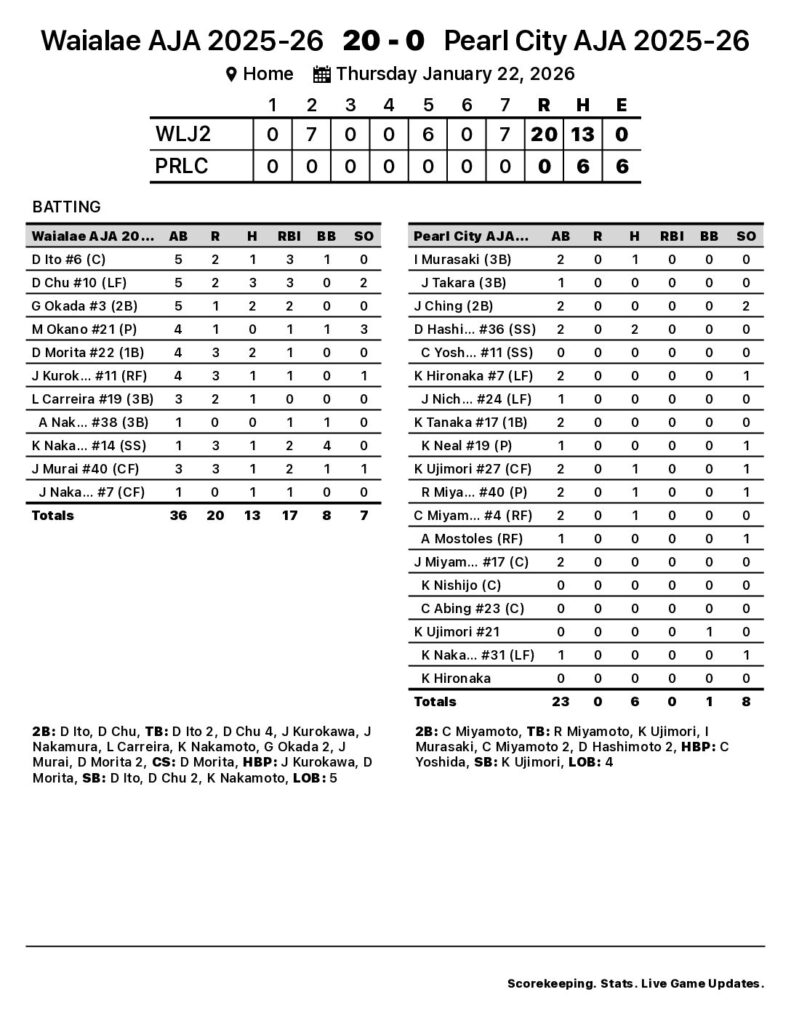 Waialae AJA 2025-26 collected 13 hits in the game. Ito and Chu were tough to handle back-to-back in the lineup, as each drove in three runs for Waialae AJA 2025-26. Chu went 3-for-5 at the plate to lead Waialae AJA 2025-26 in hits. Morita and Okada each collected multiple hits for Waialae AJA 2025-26. Nakamoto led Waialae AJA 2025-26 with four walks. Overall, the team had a strong eye at the plate, piling up eight walks for the game. Chu stole two bases. Waialae AJA 2025-26 stole four bases in the game. Waialae AJA 2025-26 didn’t commit a single error in the field. Ito had the most chances in the field with seven.